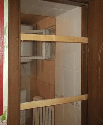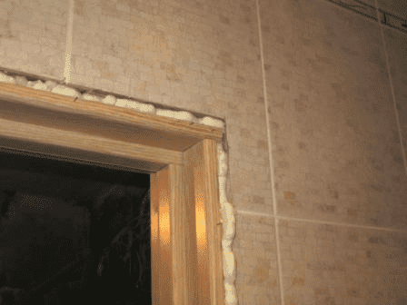 Когда все брусья будут зафиксированы, следует опять одеть дверь в петли и проверить, как хорошо она закрывается. Зазоры, которые получились между стеной и дверной коробкой чаще всего заделывают монтажной пеной, но здесь нужно быть предельно аккуратным, поскольку, во-первых, засохшую пену будет тяжело отчистить от двери, если вы ляпните не туда, во-вторых, пена расширяется, поэтому может нарушить конструкцию. Дабы избежать такого поворота событий, коробку нужно хорошо зафиксировать вставив внутрь поперечные планки. Нельзя на данном этапе работы просто закрыть дверь, таким образом используя ее вместо распорок. Когда пена высохнет, ее нужно осторожно обрезать и заштукатурить либо же заклеить обоями эти места.
